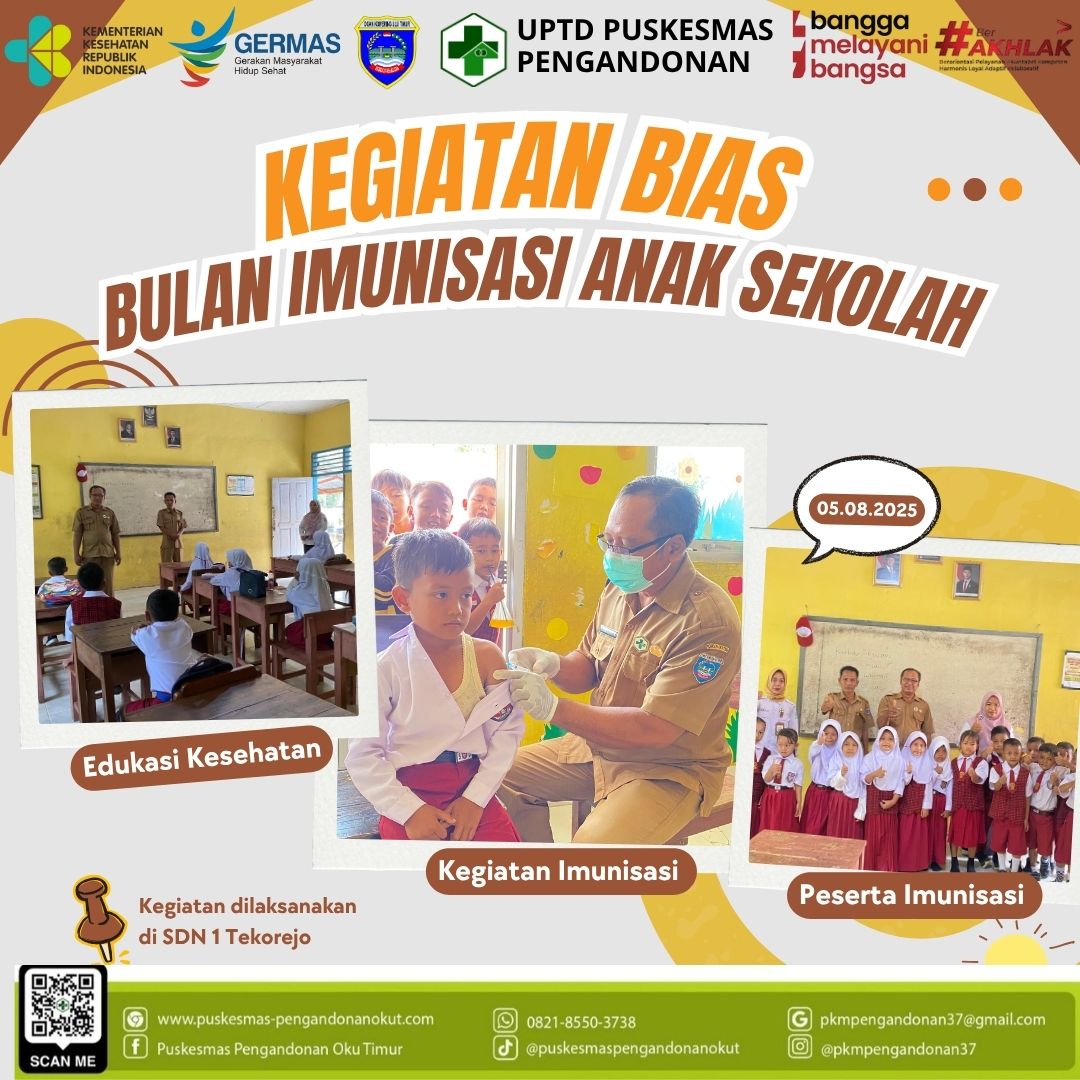 Pemberian imunisasi pada anak usia sekolah dasar atau disebut BIAS (Bulan Imunisasi Anak Sekolah) adalah pemberian imunisasi lanjutan yang bertujuan untuk meningkatkan perlindungan terhadap penyakit. Senin 5 Agustus 2025 ini Puskesmas Pengandonan melaksanakan program BIAS sesuai jadwal, meliputi pemberian vaksin MR untuk mencegah penyakit campak, rubella dan vakisn HPV untuk mencegah penyakit kanker serviks. Tujuan BIAS adalah meningkatkan kekebalan tubuh anak karena sejak anak mulai memasuki usia sekolah dasar terjadi penurunan kekebalan yang diperoleh saat imunisasi ketika bayi. Oleh karena itu pemerintah menyelenggarakan imunisasi ulangan pada anak usia sekolah dasar sederajat yang pelaksanaanya serentak di Indonesia dengan nama BIAS (Bulan Imunisasi Anak Sekolah).
