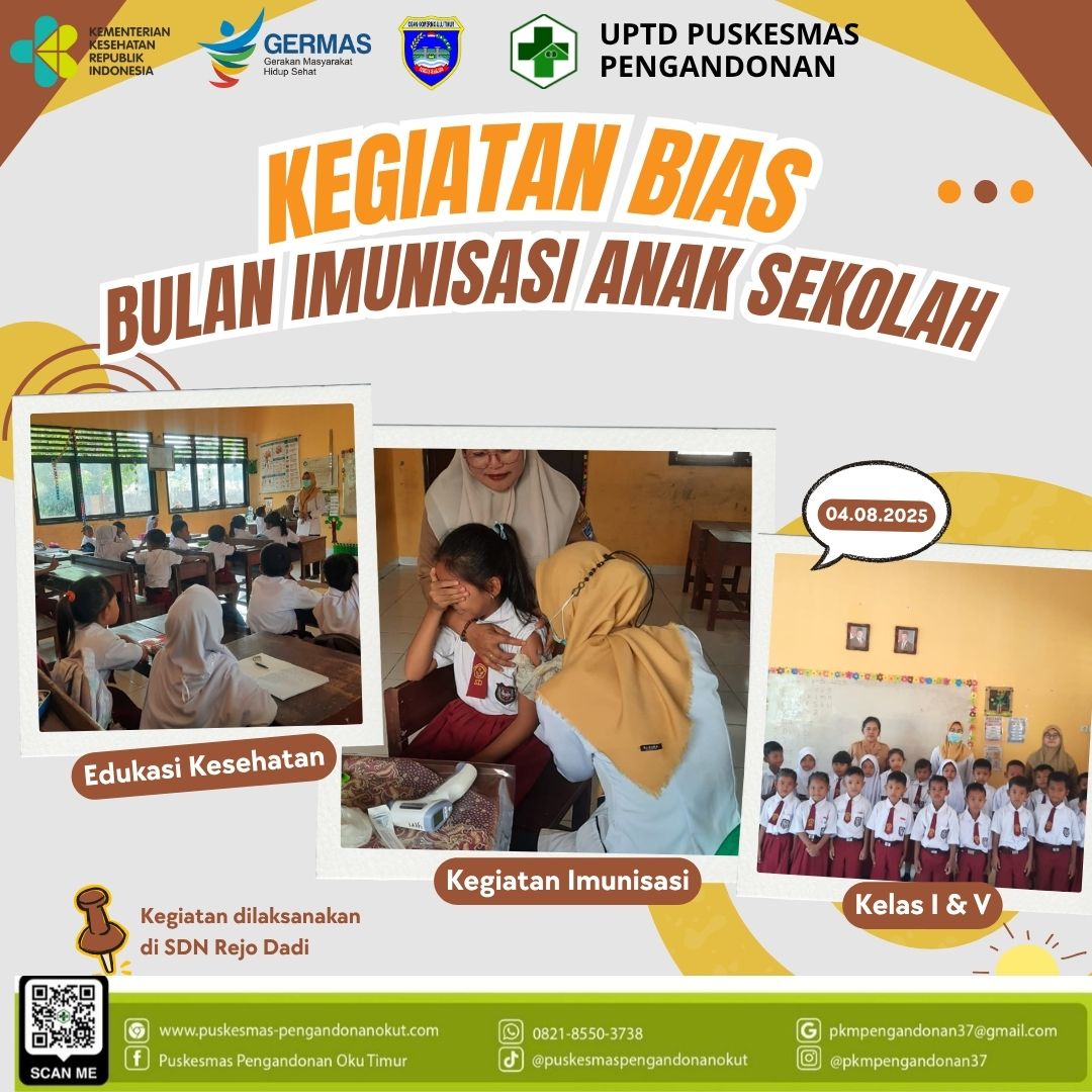 Rejo Dadi, 4 Agustus 2025 SDN Rejodadi melaksanakan kegiatan Bulan Imunisasi Anak Sekolah (BIAS) sebagai bagian dari program nasional imunisasi yang menyasar anak usia sekolah dasar. Dalam kegiatan ini, tim BIAS yang terdiri dari Bidan Desa dari Puskesmas Pengandonan turun langsung ke sekolah untuk memberikan imunisasi kepada siswa sesuai jenjang kelas.